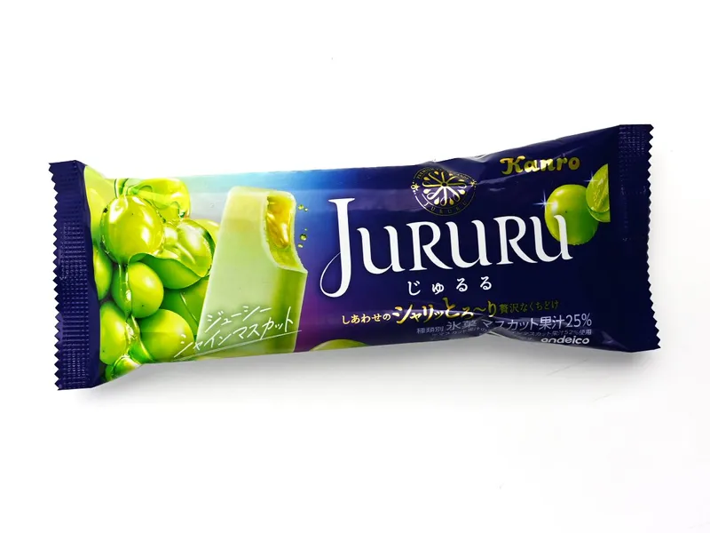 1/6大ヒットキャンディ「じゅるる シャインマスカット」をアイスバーで再現。シャリッとした氷皮の中に、なめらかなシャインマスカットアイスと濃厚なマスカットソースを閉じ込めた3層構造。マスカット果汁25%使用で、かじるたびにとろりとソースがあふれ出す「じゅるる体験」を楽しめる氷菓。カンロ監修、栄屋乳業製造。